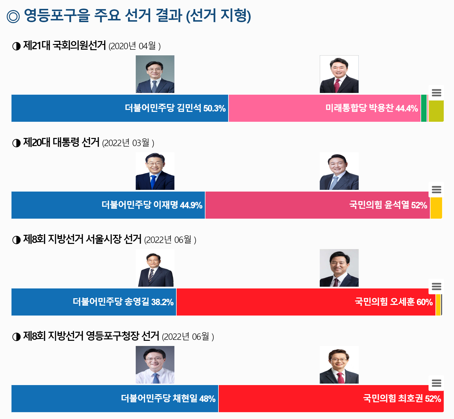 ¿µµîÆ÷±¸À» ¼±°Å±¸´Â ±¹¹ÎÀÇÈûÀÌ ÃÖ±Ù 3°ÇÀÇ ¼±°Å¿¡¼ ¸ðµÎ ½Â¸®ÇÑ Áö¿ªÀ¸·Î, ±¹¹ÎÀÇÈûÀº Á¦20´ë ´ëÅë·É ¼±°Å, ¼¿ï½ÃÀå ¼±°Å, ¿µµîÆ÷±¸Ã»Àå ¼±°Å¿¡¼ ½Â¸®ÇÏ¿´´Ù.