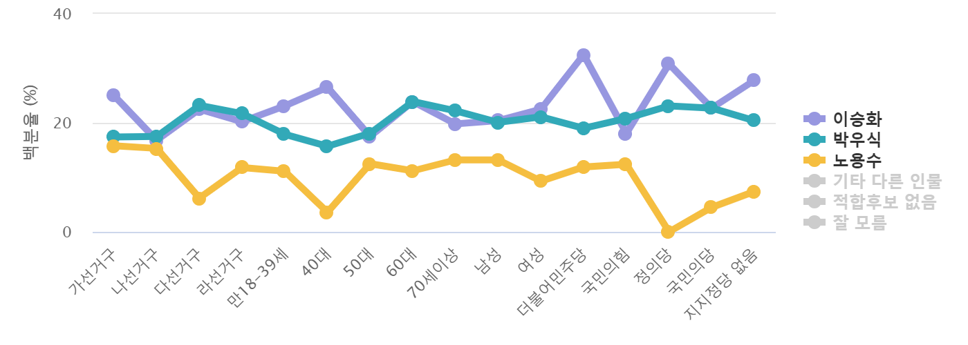 À̽ÂÈ È帴 "40´ë" ¿¬·É´ë¿¡¼ 2À§ ¹Ú¿ì½Ä Èĺ¸º¸´Ù 10%p ÀÌ»ó Å« Â÷ÀÌ·Î ³ôÀº ÁöÁö¸¦ ¹Þ¾ÒÀ¸¸ç "¸¸18-39¼¼" ¿¬·É´ë¿¡¼ ¹Ú¿ì½Ä Èĺ¸º¸´Ù 5.2%p ³ô¾ÒÀ¸¸ç,¹Ú¿ì½Ä È帴 "60´ë","70¼¼ÀÌ»ó","50´ë" ¿¬·É´ë¿¡¼ À̽ÂÈ Èĺ¸¿Í 3% À̳» Á¢ÀüÀ» º¸À̸ç , À̽ÂÈ È帴 "¿©¼º","³²¼º" ÀÀ´äÃþ¿¡¼ ¹Ú¿ì½Ä Èĺ¸¿Í 3% À̳» Á¢ÀüÀ» º¸¿´´Ù.